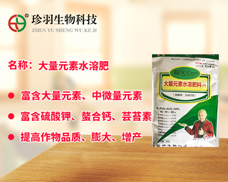大量元素水溶肥料為經(jīng)水溶解或稀釋,用于灌溉施肥、葉面施肥、無土栽培、浸種蘸根等用途的液體或固體產(chǎn)品,可以葉面施肥、浸種蘸根、灌溉施肥,灌溉包括噴灌、滴灌等方式進(jìn)行灌溉時(shí)施肥,既節(jié)約用水,又節(jié)約施肥,而且還植物吸收快,大量元素水溶肥是一種可以完全溶于水的多元復(fù)合肥料,它能迅速地溶解于水中,更容易被作物吸收,而且其吸收利用率相對較高,我們看一下珍羽生物的大量水溶肥。